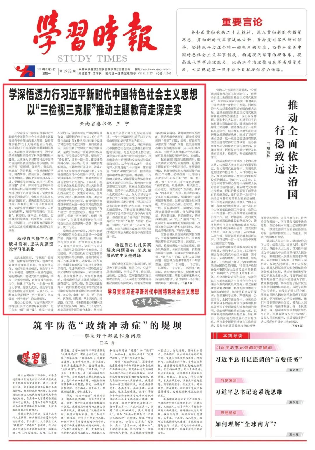 7月31日 《学习时报》头版头条刊发 云南省委书记王宁署名文章 《学深悟透力行习近平新时代中国特色社会主义思想 以“三检视三...