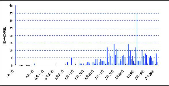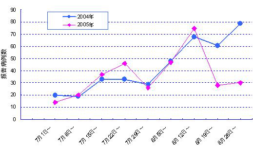 4、由于2004年在8月份和9月下旬各出现了一个发病高峰,虽然2005年急性血吸虫病呈下降趋势,但须防止9月份发病回升。