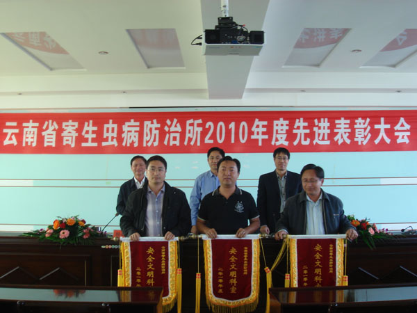 春节前夕,所党支部召开2010年度先进表彰大会,对我所的3个2010年度安全文明科室、16名2010年度先进工作者、7名业务技术标兵、3名2010年度青年岗位能手、1名2010年度优秀共青团员及27户五好文明家庭进行了表彰。所领导为获奖的3个科室(行政办、疟防科、虫媒科)当场颁发了锦旗。