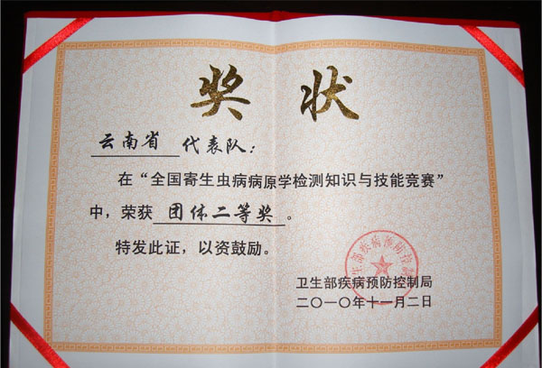 今年11月初,创新团队队员王剑同志代表我省疾控部门参加了由卫生部疾病预防控制局和中国疾病控制中心寄生虫病预防控制所在江苏省无锡市主办的全国寄生虫病病原学检测知识和技能竞赛。凭着精湛的专业知识和技能,王剑在疟疾组的比赛中获得了个人二等奖,并与我省其他单位的代表一起团结拼搏,最终为我省取得了团体二等奖的优异成绩。