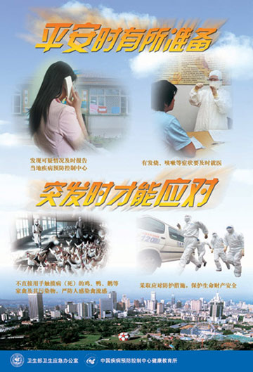 中国疾病预防控制中心健康教育所社区指导中心受卫生部卫生应急办公室的委托,近日设计制作了平安时有所准备,突发时才能应对预防禽流感宣传画和折页各1套,现已由卫生部卫生应急办公室印制,并下发到各省、自治区、直辖市卫生厅(局),宣传画和折页可直接从全国健康教育工作网下载( http://www.nihe.org.cn/articles.php?id=2450)。