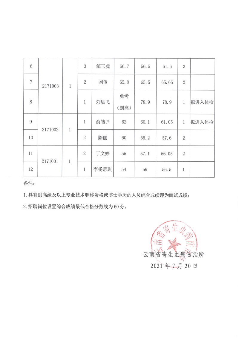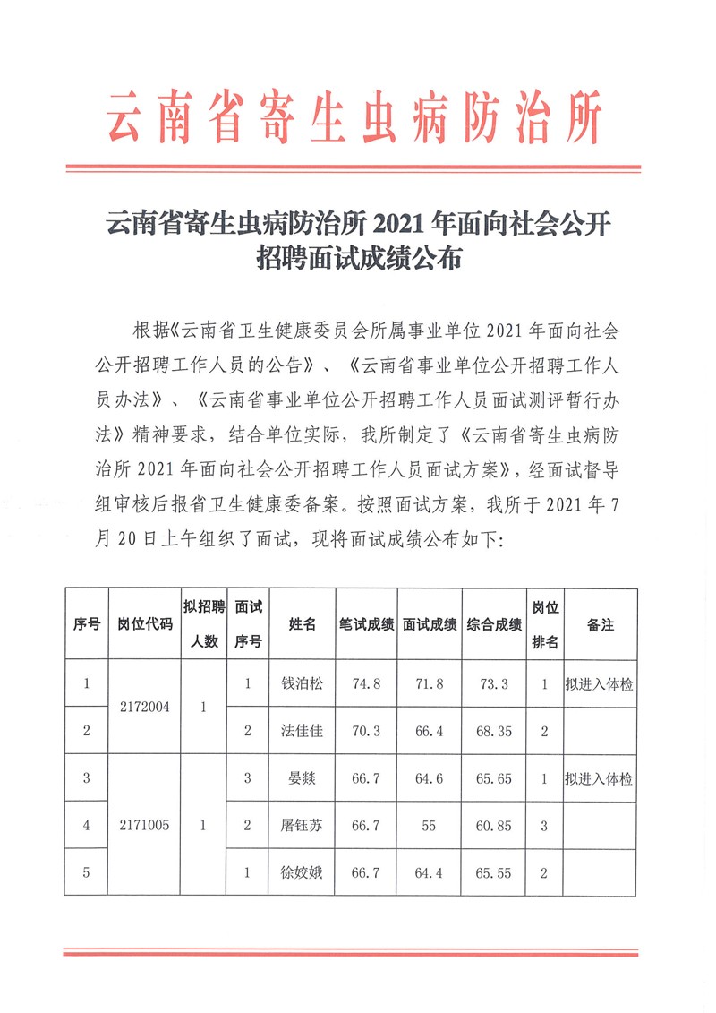 云南省寄生虫病防治所2021年公开招聘面试成绩公布.pdf