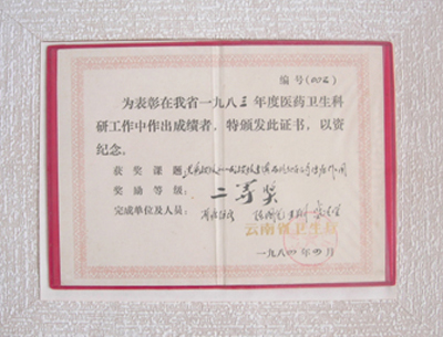 获1983年度云南省卫生厅科技成果二等奖获奖单位及人员:陈国光 王翔 盛次星 云南省疟疾防治研究所
