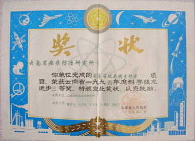 一九九四年度荣获云南省人民政府科学技术进步三等奖