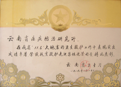 表现突出成绩卓著,荣获抗震救护先进集体光荣称号云南省卫生厅一九九三年二月二十日