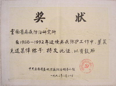 1988-1992年边境疟疾防护工作中,荣获先进修集体称号中共云南省委地方病防治领导小组
