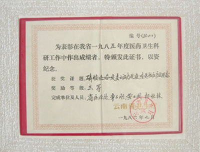 获1985年度云南省卫生厅科技进步三等奖获奖单位及人员:车立刚 黄开国 杨恒林 云南省疟疾防治研究所