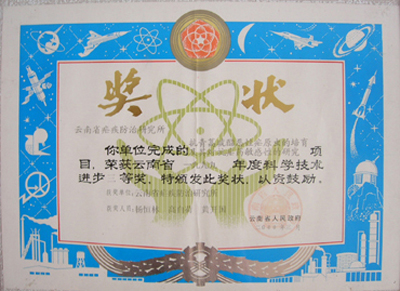 一九九九年荣获云南省人民政府抗青蒿琥酯恶性疟原虫的培育及其对抗疟药敏感性的研究获奖人:杨恒科 高白荷 黄开国