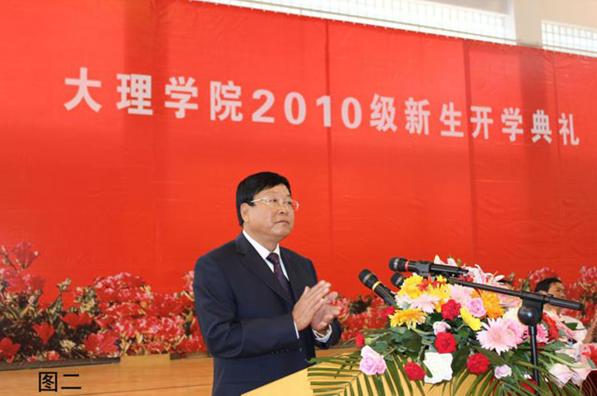 学校党委副书记、校长戴志明在开学典礼上讲话。他向新生介绍了我校的基本情况、各方面取得的成绩及今年的招生情况,阐述了学校第一次党代会提出的办学指导思想、十二五期间学校的发展目标。他满怀深情地说,同学们,你们满怀理想和希望,怀着对美好未来的憧憬,来到大理学院,翻开了人生崭新的篇章。他对新生们表示热烈的祝贺!他感谢2010级的新生选择了大理学院。他相信新生们来到这里,一定不会希望成为百花园里的匆匆过客,更不愿意虚度青春年华。他说,你们将用在大理学院的有限时光,为你们将来实现理想、成就事业做好充分准备,从这里起步,从这里出发,扬帆远航。他希望同学们学会做人、学会学习、立志成才。