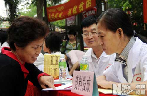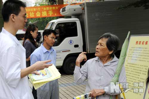 4月24日,医务工作者在向市民讲解预防疟疾知识。 当日,海南省卫生部门在海口市明珠广场举办大型防疟疾保健康宣传活动。4月26日是第一个全国疟疾日,今年的主题是疟疾--一种没有国界的疾病。根据世界卫生组织报告,全球大约40%的人口受疟疾威胁,每年有3.5亿至5亿人感染疟疾,110万人因疟疾死亡。新华社记者 郑玮娜 摄